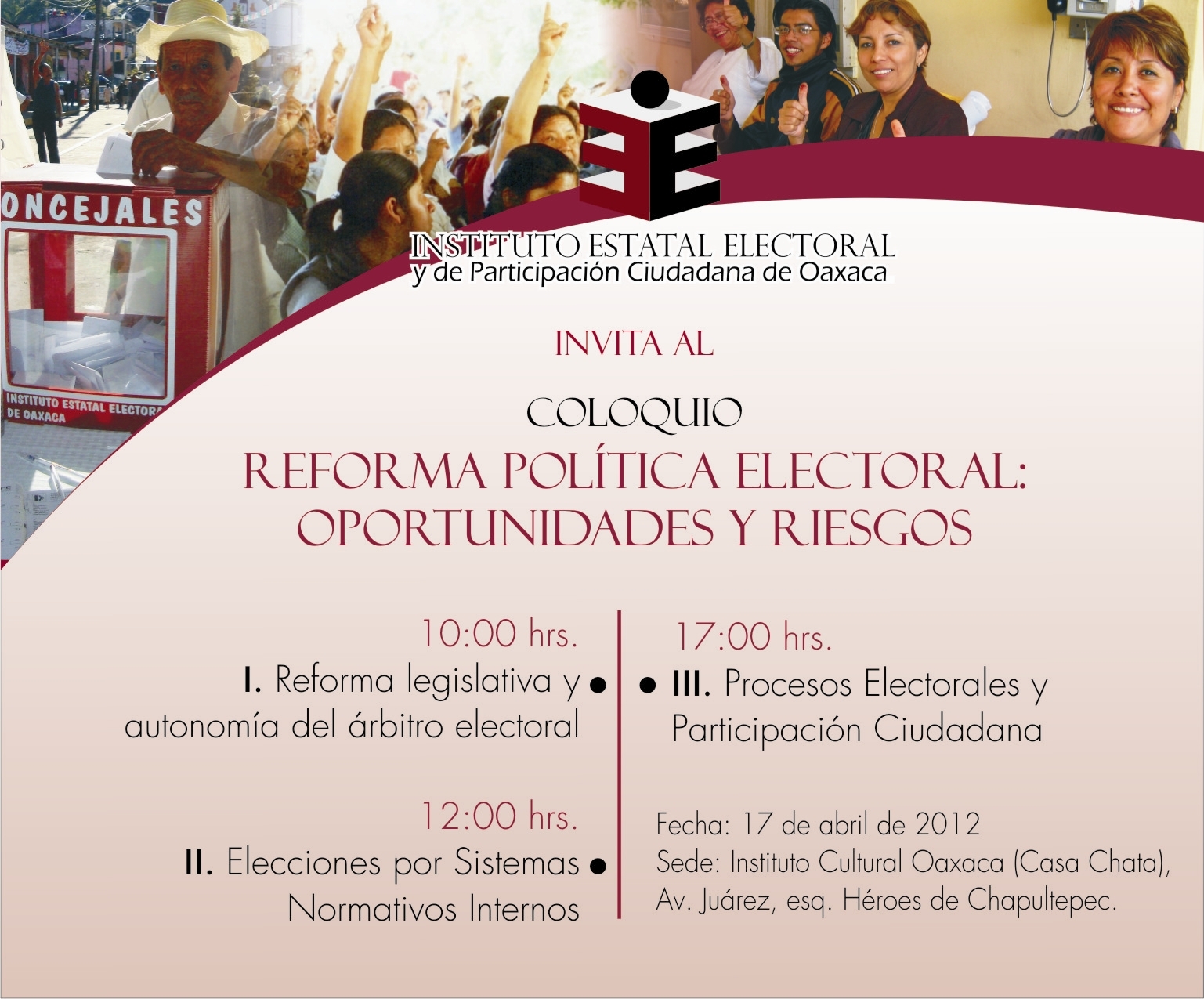 El Instituto Estatal Electoral y de Participación Ciudana le invita al Coloquio Reforma político electoral: oportunidades y riesgos, que se llevará a cabo el martes 17 de abril, a partir de las 10:00 hrs. en el Instituto Cultural Oaxaca (Casa Chata) Av. Juárez, esq. Héroes de Chapultepec.