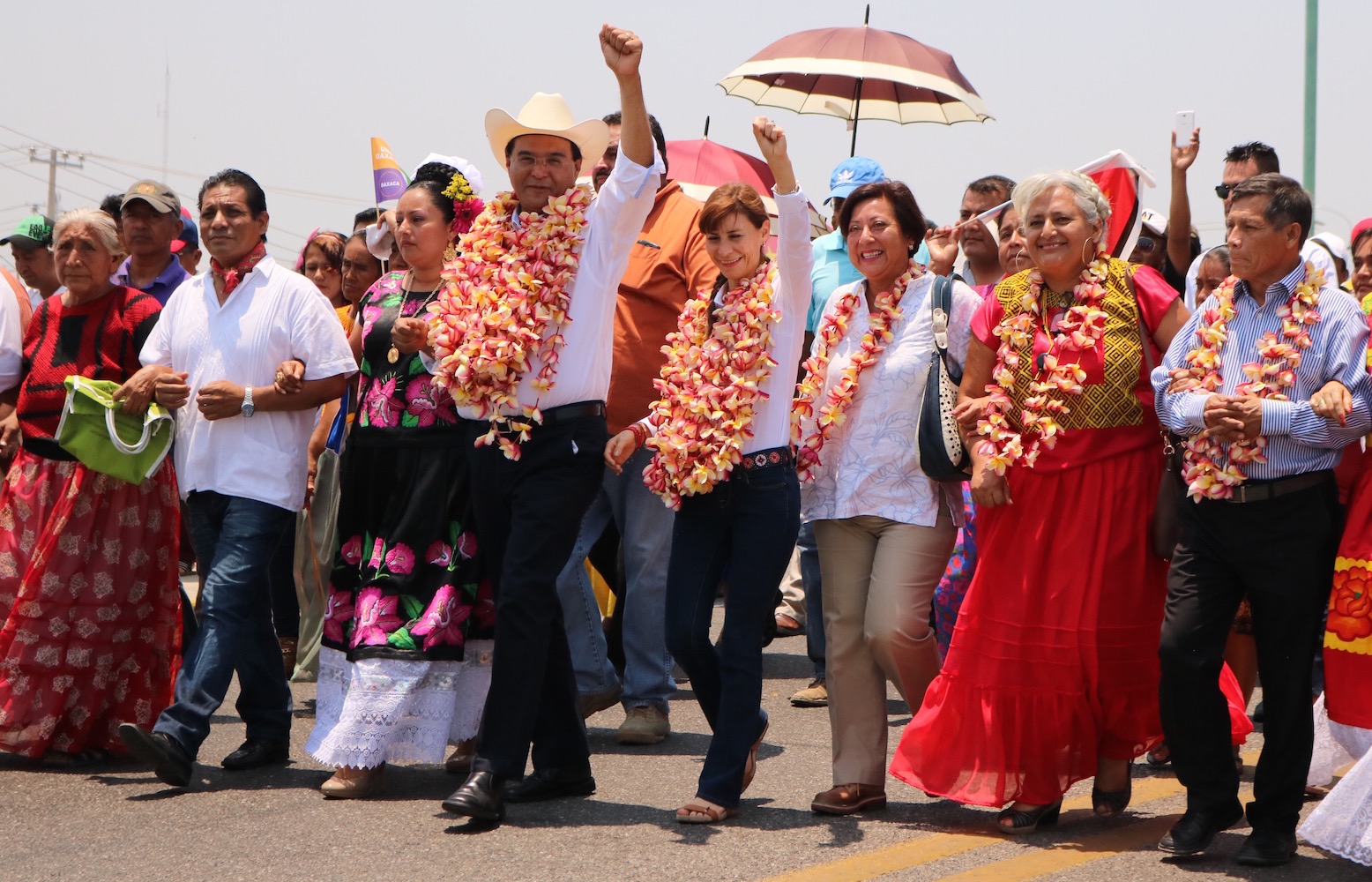 Ataviadas con huipiles y enaguas de flores bordadas, refajos, holanes y vistosas trenzas, Guadalupe Sánchez, Ernestina Villalobos de los Santos y Leidi Ricoy Villalobos, en representación de las mujeres juchitecas alzaron la voz con un “Ya basta de los poderosos” para estrechar la mano de Benjamín Robles en señal de que la fuerza istmeña de esta población lo apoya.