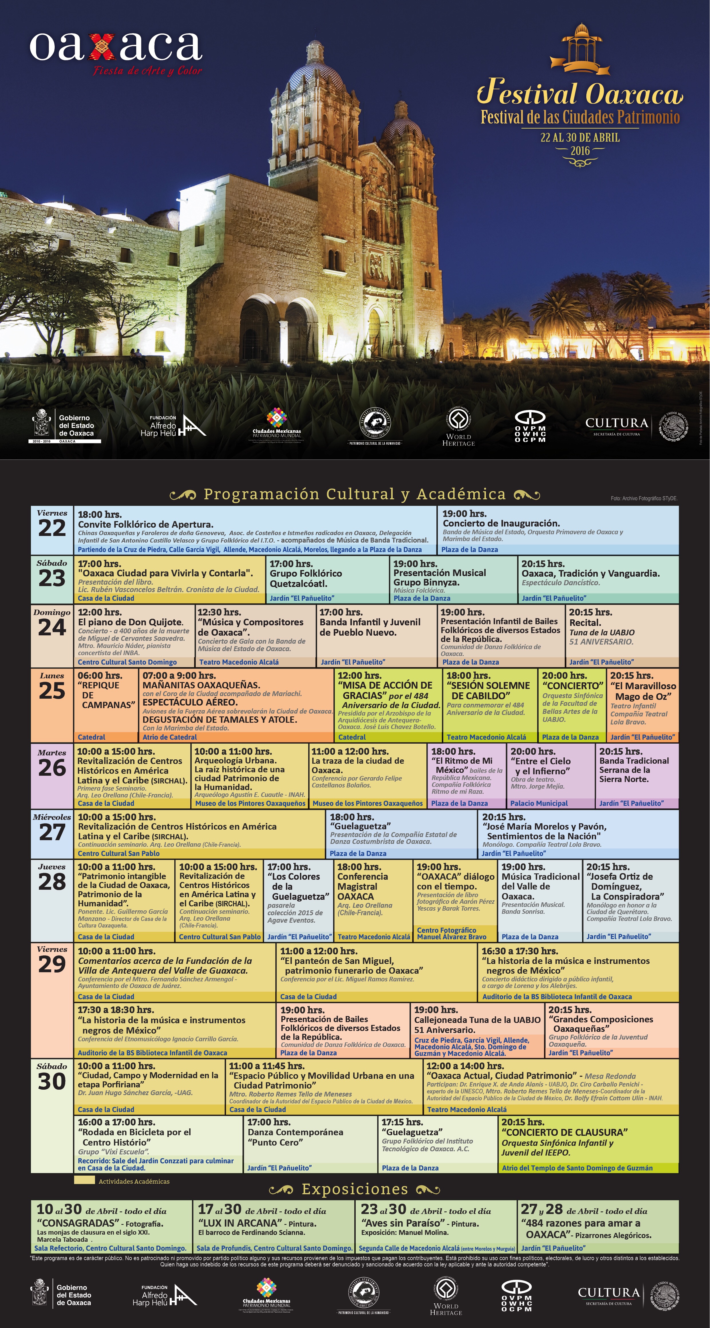 Más de 50 actividades culturales, artísticas y musicales darán vida al “Festival Oaxaca, Festival de las Ciudades Patrimonio”, que se llevará a cabo del 22 al 30 de abril en conmemoración al 484 aniversario de la elevación de la Villa de Antequera al rango de Ciudad.
