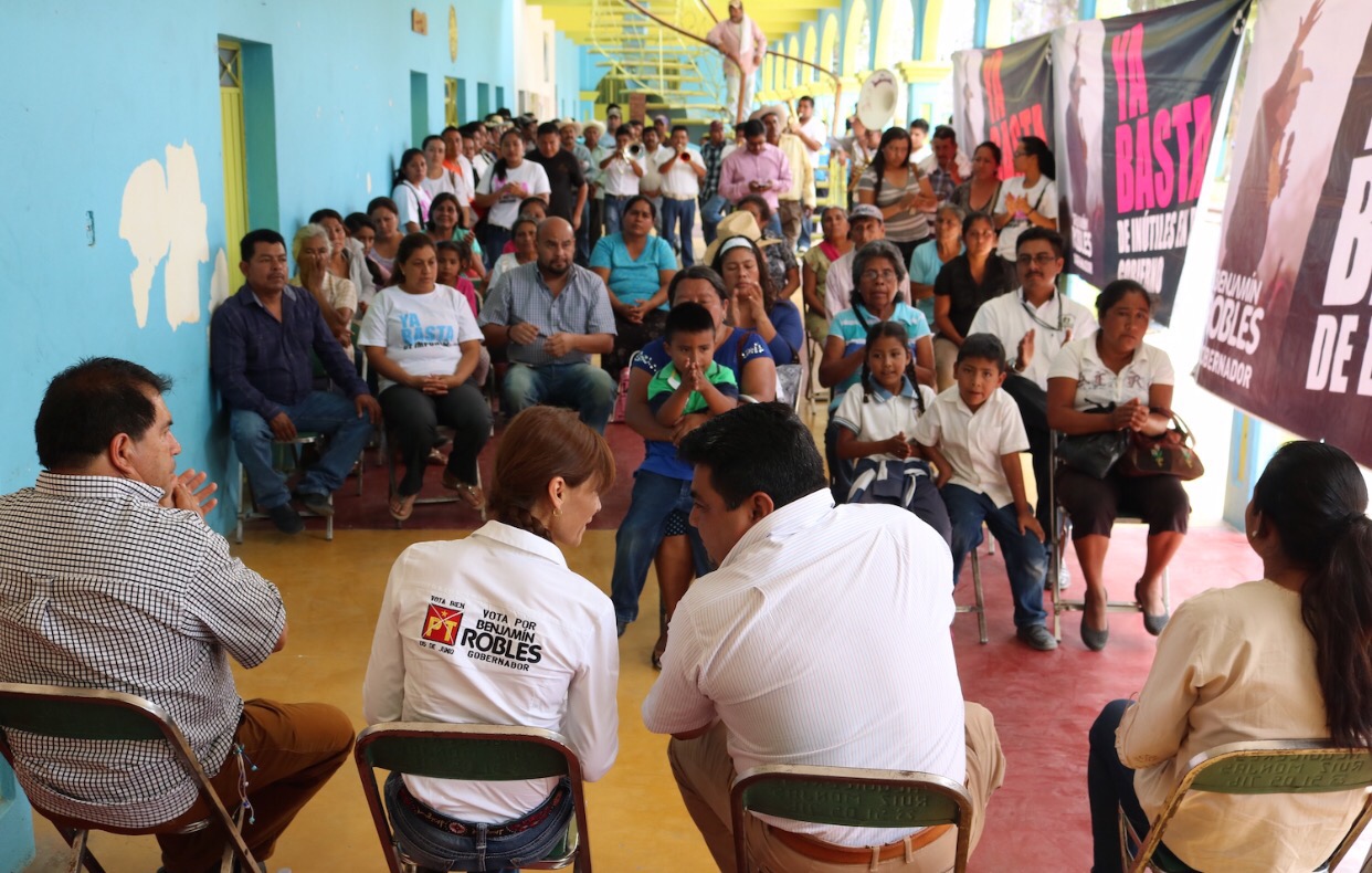 Así se refirió Maribel Martínez de Robles, esposa del abanderado del partido de la estrella, al reunirse con hombres y mujeres de San Miguel Coatlán, que viven entre la montaña y en donde, gracias a las gestiones de Benjamín Robles, ahora cuenta con luz eléctrica.