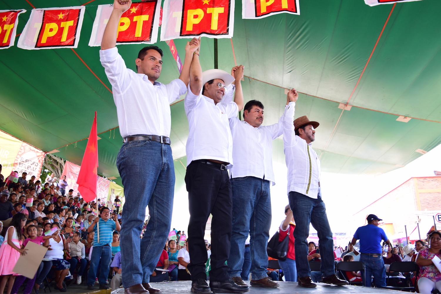 E inmediatamente fue ovacionado por el candidato a diputado por el distrito 15, Javier Matías Aquino; Daniel Juárez López, coordinador de campaña de diputados por el PT; Jesús López del Frente Democrático Popular (FDP); por las agrupaciones Pedro Moreno, Rayón y Opción Popular; y por habitantes de las colonias Vicente Guerrero, Renacimiento y Campo Real.