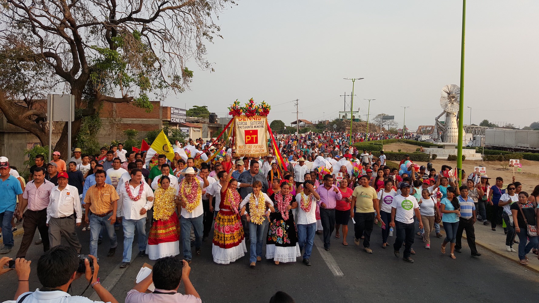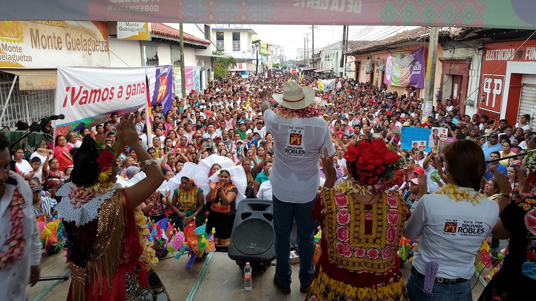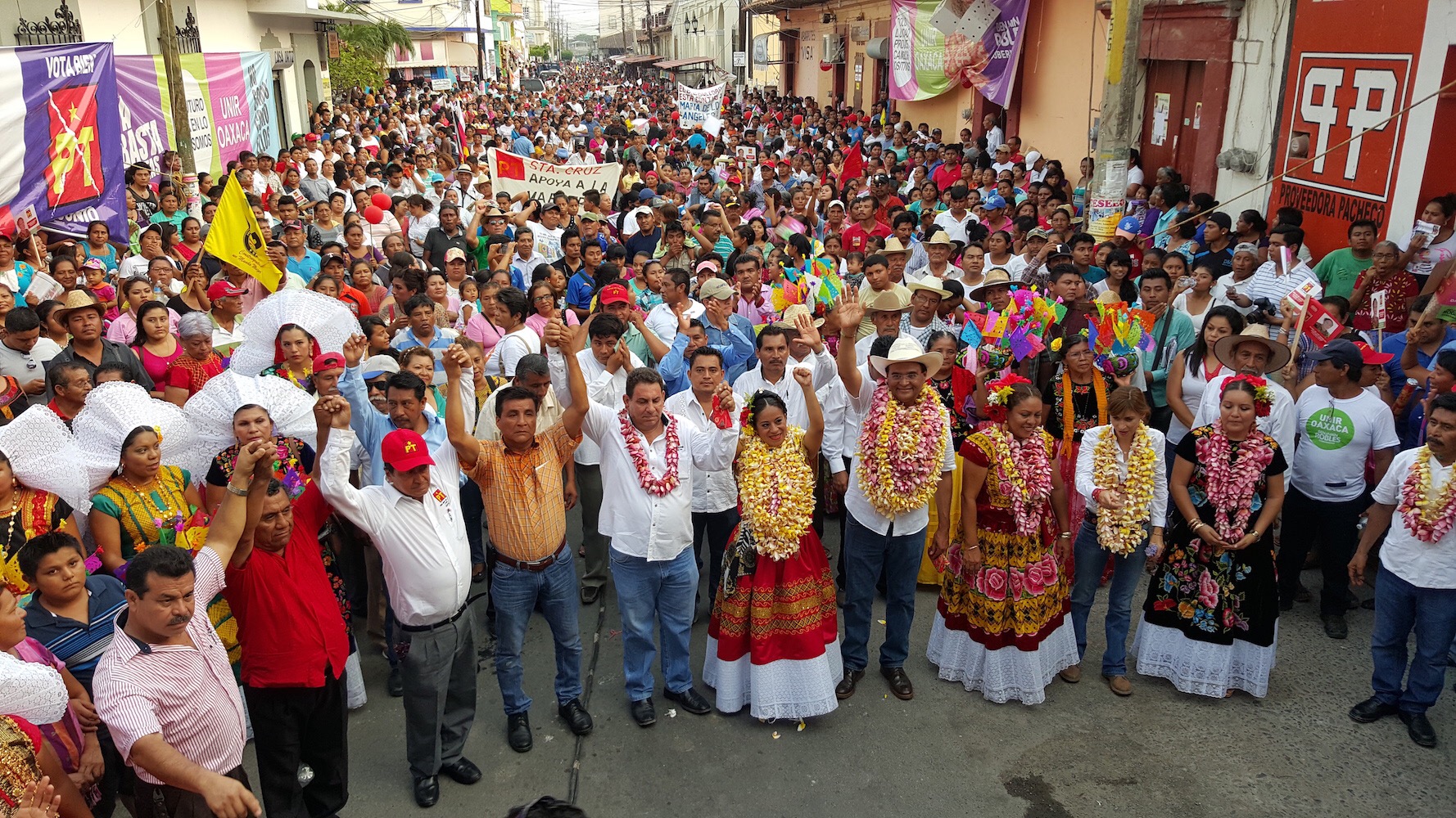 En un encuentro inédito, como nunca antes registrado en favor de un candidato a gobernador y una candidata a presidenta municipal, miles de hombres y mujeres zapotecas de Santo Domingo Tehuantepec, con banderas del Partido del Trabajo (PT), encabezaron una multitudinaria caminata del triunfo y un desbordante mitin en favor de Benjamín Robles Montoya, Dennis García Gutiérrez y María de los Ángeles Martínez Gómez.