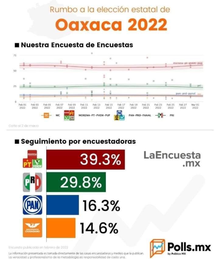 Encuesta tras encuesta, es visible el incremento del candidato del Partido Revolucionario Institucional (PRI), obteniendo 29.8% puntos rumbo a la elección estatal de Oaxaca 2022.