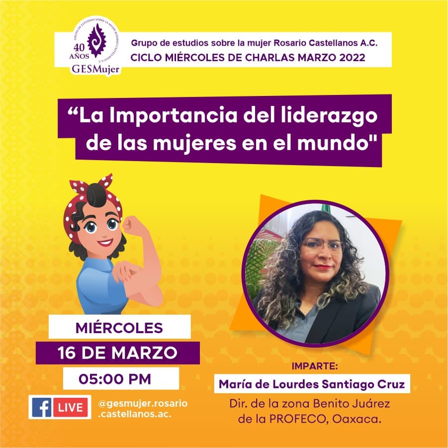 Por ello, este mes, dentro del marco de la reciente conmemoración del 8 de marzo, “Día Internacional de la Mujer”, el Grupo de Estudios sobre la Mujer Rosario Castellanos (GESMujer A.C.), ofrecerá este próximo miércoles 16 de marzo, la charla virtual “La importancia del liderazgo de las mujeres en el mundo”, impartida por María de Lourdes Santiago Cruz, directora de la zona Benito Juárez de la Procuraduría Federal del Consumidor (PROFECO) en Oaxaca.