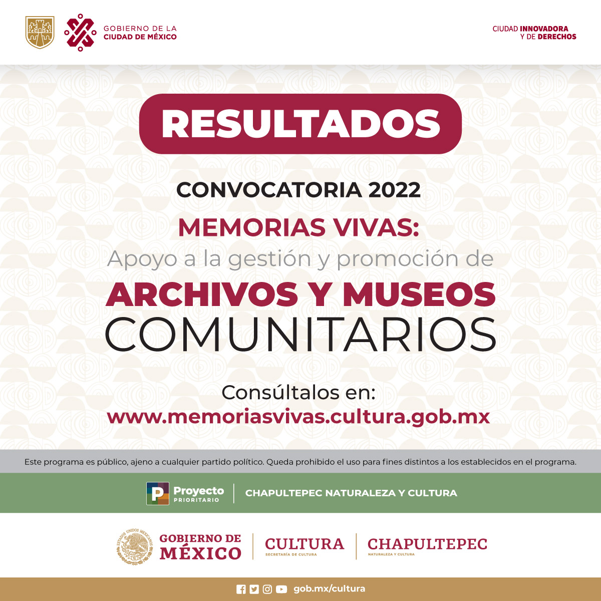 La Secretaría de Cultura del Gobierno de México, a través de la Dirección General de Vinculación Cultural, en coordinación con la Secretaría de Cultura de la Ciudad de México y en el marco del proyecto prioritario Chapultepec, Naturaleza y Cultura, da a conocer los resultados de la convocatoria Memorias vivas: Apoyo a la gestión y promoción de archivos y museos comunitarios 2022.
