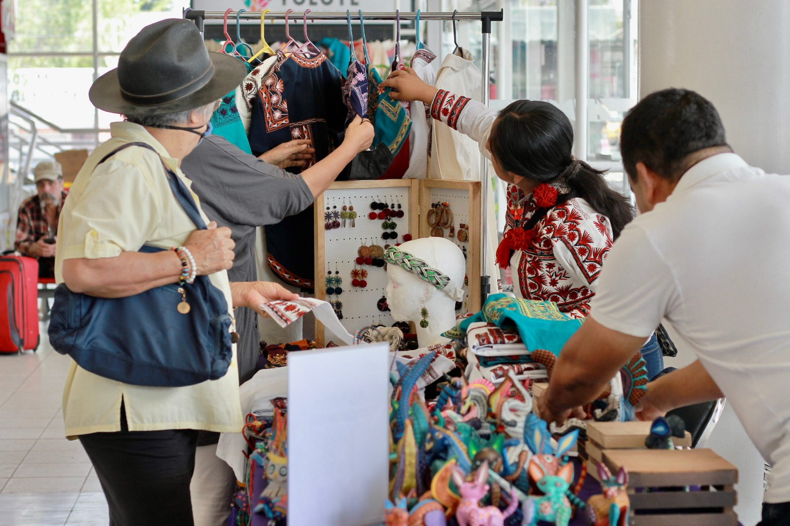 Oaxaca de Juárez, Oax. 5 de abril de 2023.- Artistas indígenas y populares que se dedican a la elaboración de textiles de Tlahuiltoltepec y Juchitán, alfarería y cerámica de San Bartolo Coyotepec, madera tallada y alebrijes de San Martín Tilcajete, hojalatería, fibras vegetales y plumaria de Cuilápam de Guerrero, mostraron sus creaciones en las instalaciones de la Terminal de la empresa Autobuses de Oriente en la capital del estado.