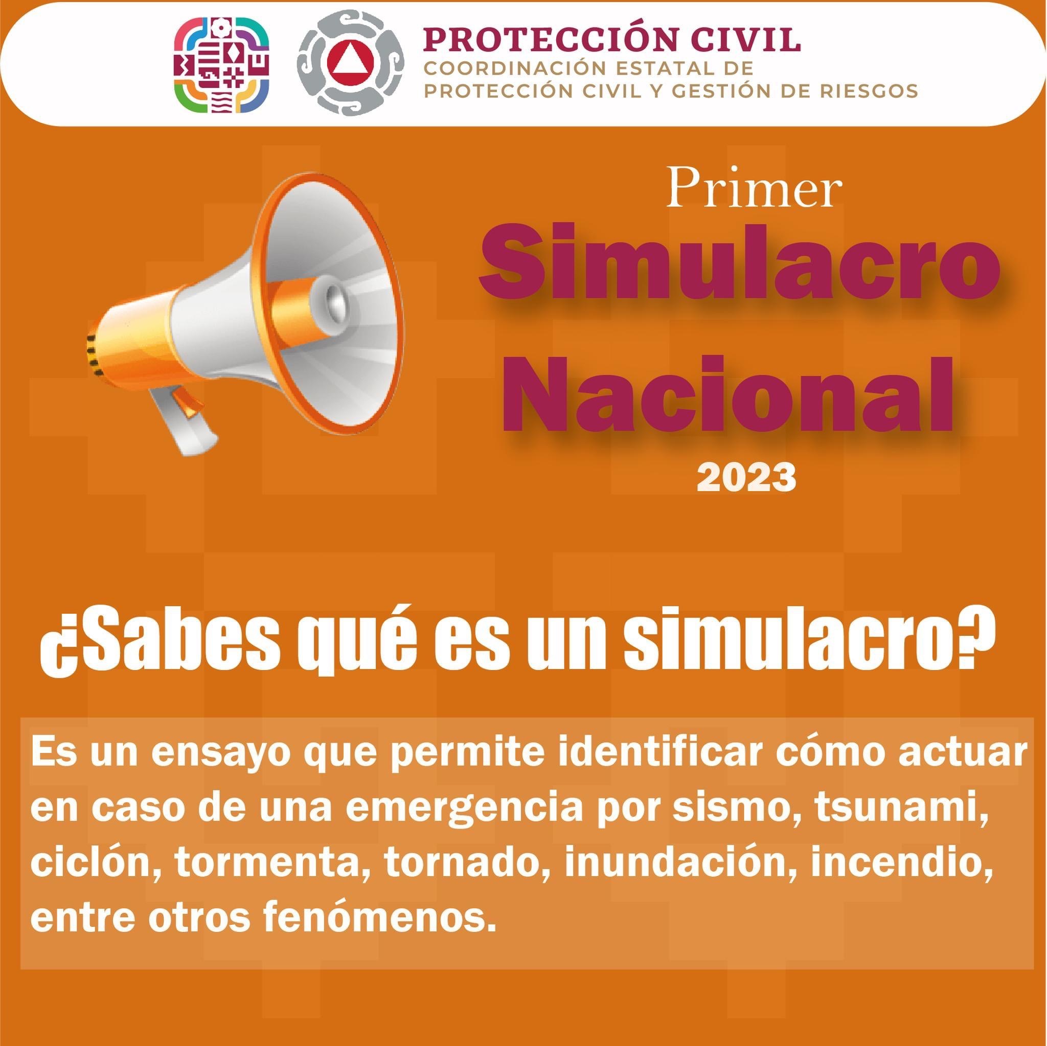 Los simulacros tienen el objetivo de identificar qué hacer y cómo actuar en caso de una emergencia, resultado del desarrollo de fenómenos perturbadores antropogénicos y naturales, por lo que se podrá participar con diferentes propuestas de escenarios como hipótesis, las cuales se establecerán en el registro de inmuebles, el cual se puede realizar en preparados.gob.mx/1ersimulacronacional2023/ y cierra el 18 de abril.