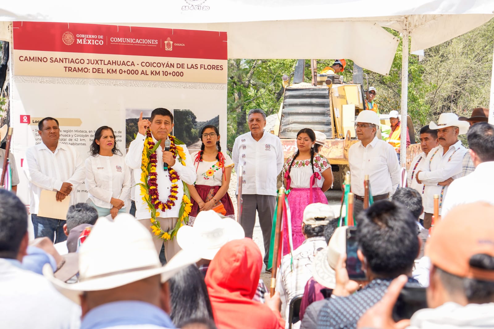 San Sebastián Tecomaxtlahuaca, Oax. 3 de mayo de 2023.- El Gobernador del Estado Salomón Jara Cruz dio aquí el banderazo de inicio de los trabajos para la construcción del camino que comunica al municipio de Santiago Juxtlahuaca con el de Coicoyán de las Flores, el cual beneficiará a 25 mil oaxaqueñas y oaxaqueños.