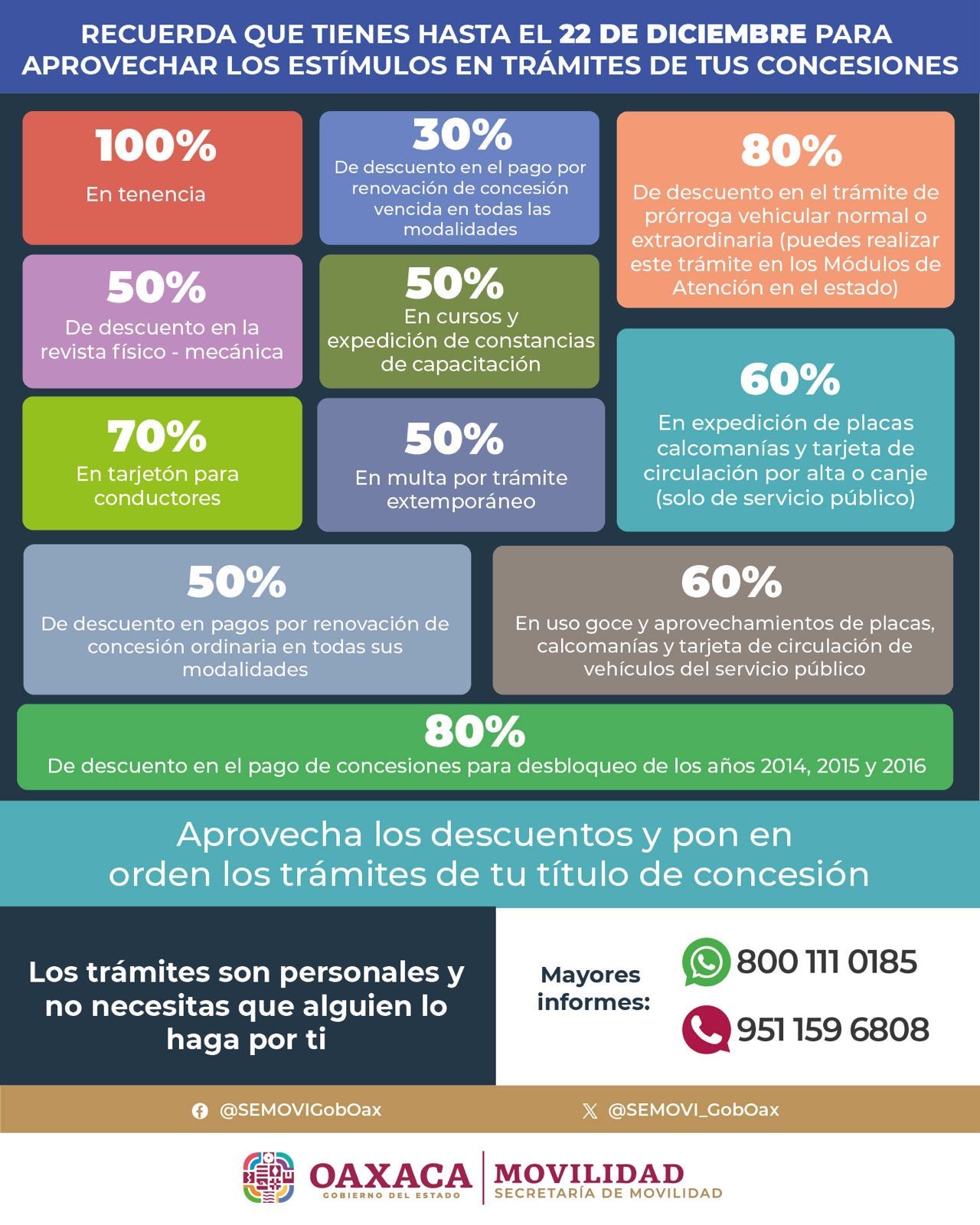 San Antonio de la Cal, Oax. 19 de diciembre de 2023.- La Secretaría de Movilidad (Semovi) invita a las personas concesionarias a hacer uso del programa de estímulos fiscales para actualizar y renovar los trámites de sus títulos de concesión.