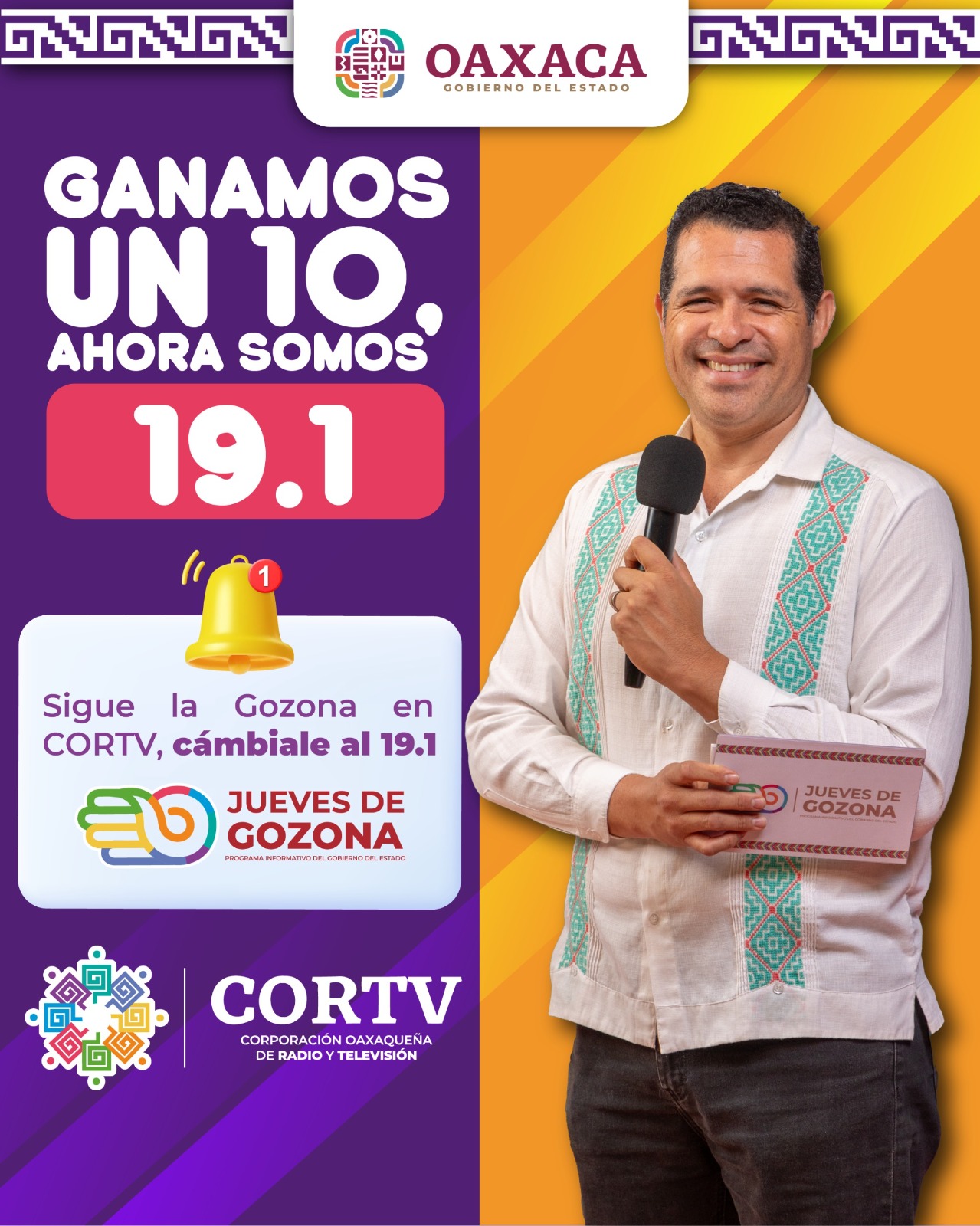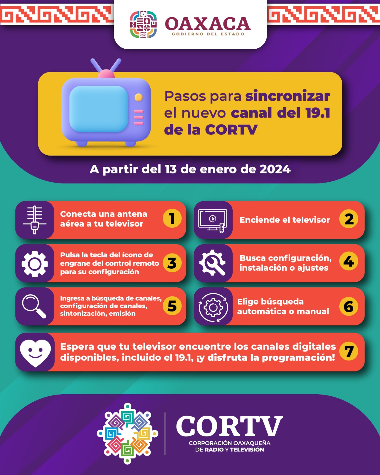 Oaxaca de Juárez, Oax. 4 de enero de 2024.- Como parte de la transformación en Oaxaca, a partir del 13 de enero la Corporación Oaxaqueña de Radio y Televisión (Cortv) migrará su señal de televisión abierta del 9.1 al 19.1.