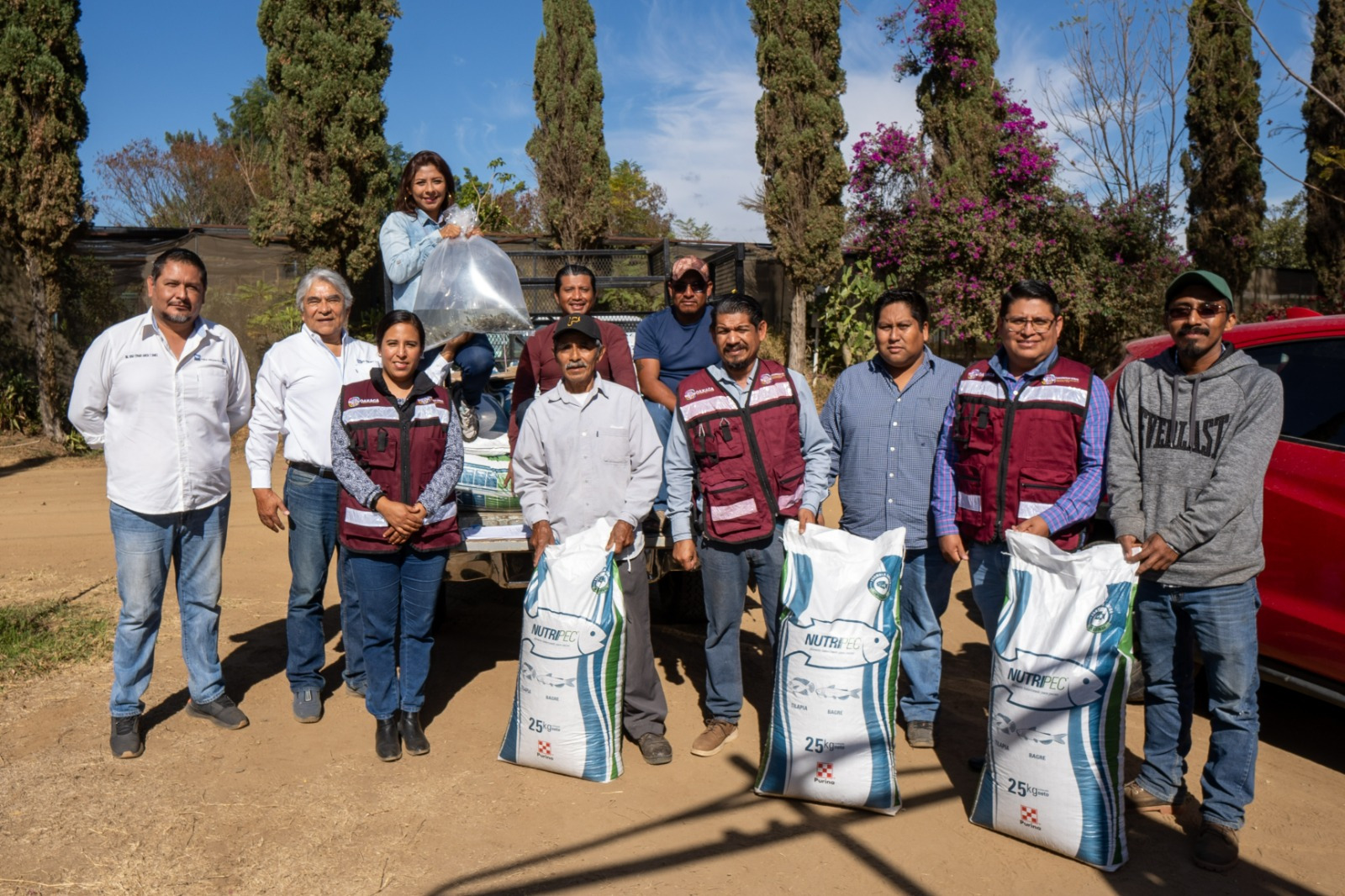 En este espacio ubicado en el municipio de Santa Cruz Xoxocotlán, personal de la Dirección de Pesca y Acuacultura de la Sefader, a cargo del biólogo Juan Antonio Ortega Amador, entregaron alevines o crías de tilapia a seis personas productoras de Valles Centrales y de la Sierra Sur, además de proveerlos con 2.8 toneladas de alimento balanceado (114 bultos), como parte del programa de Autosuficiencia Alimentaria que impulsa la dependencia.