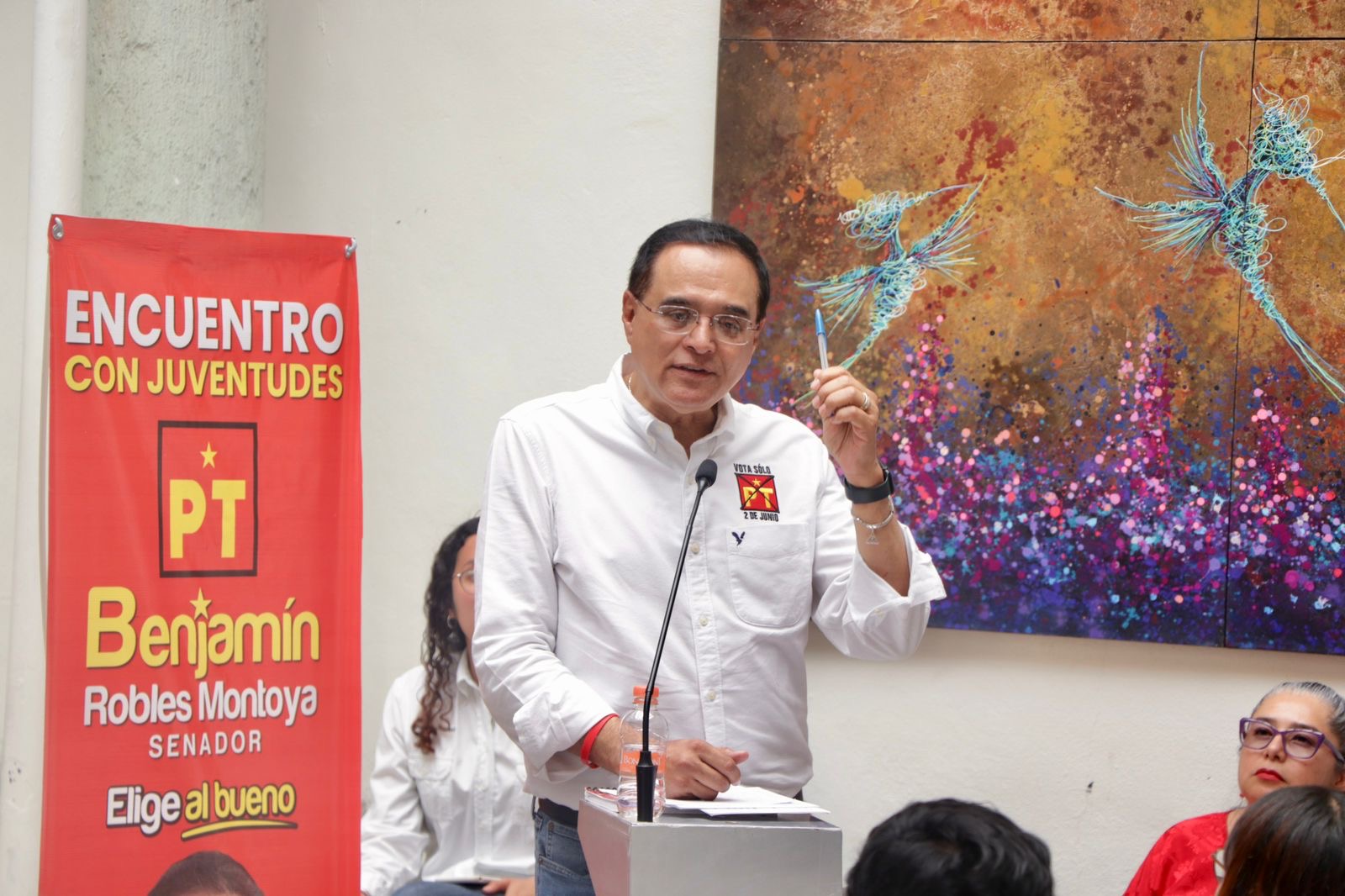 El candidato a Senador por el Partido del Trabajo (PT), Benjamín Robles Montoya realiza una intensa campaña para conversar con la ciudadanía oaxaqueña, reflexionando juntos sobre: ¿Qué tipo de representantes legislativos quieren para que se defiendan sus causas en el Congreso de la Unión? ¿Los quieren honestos o sospechosos? ¿Elegirán Al Bueno -al que ya conocen y les ha dado resultados- o Al Malo -de quien nadie sabe sus verdaderas intenciones-?
