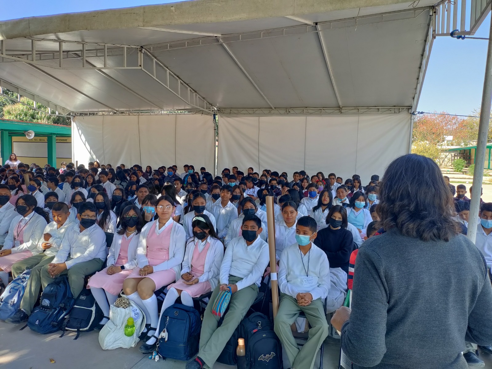 Con eso en mente, el equipo de GESMujer visitó las instalaciones de la escuela secundaria 27 de Septiembre, ubicada en el municipio de Santiaguito Etla, para platicar con más de 500 estudiantes sobre la violencia digital, compartiendo algunas herramientas básicas sobre seguridad en línea que pueden reducir el riesgo a ser víctimas de estas nuevas prácticas. El estudiantado mostró una escucha y participación activa ante la intervención de la Dra. Soledad Venegas Nava, quien habló abiertamente sobre el derecho al pleno uso de las nuevas tecnologías en diferentes aspectos de la vida cotidiana de los y las adolescentes, que aseguraron comprender los riesgos que esto conlleva.