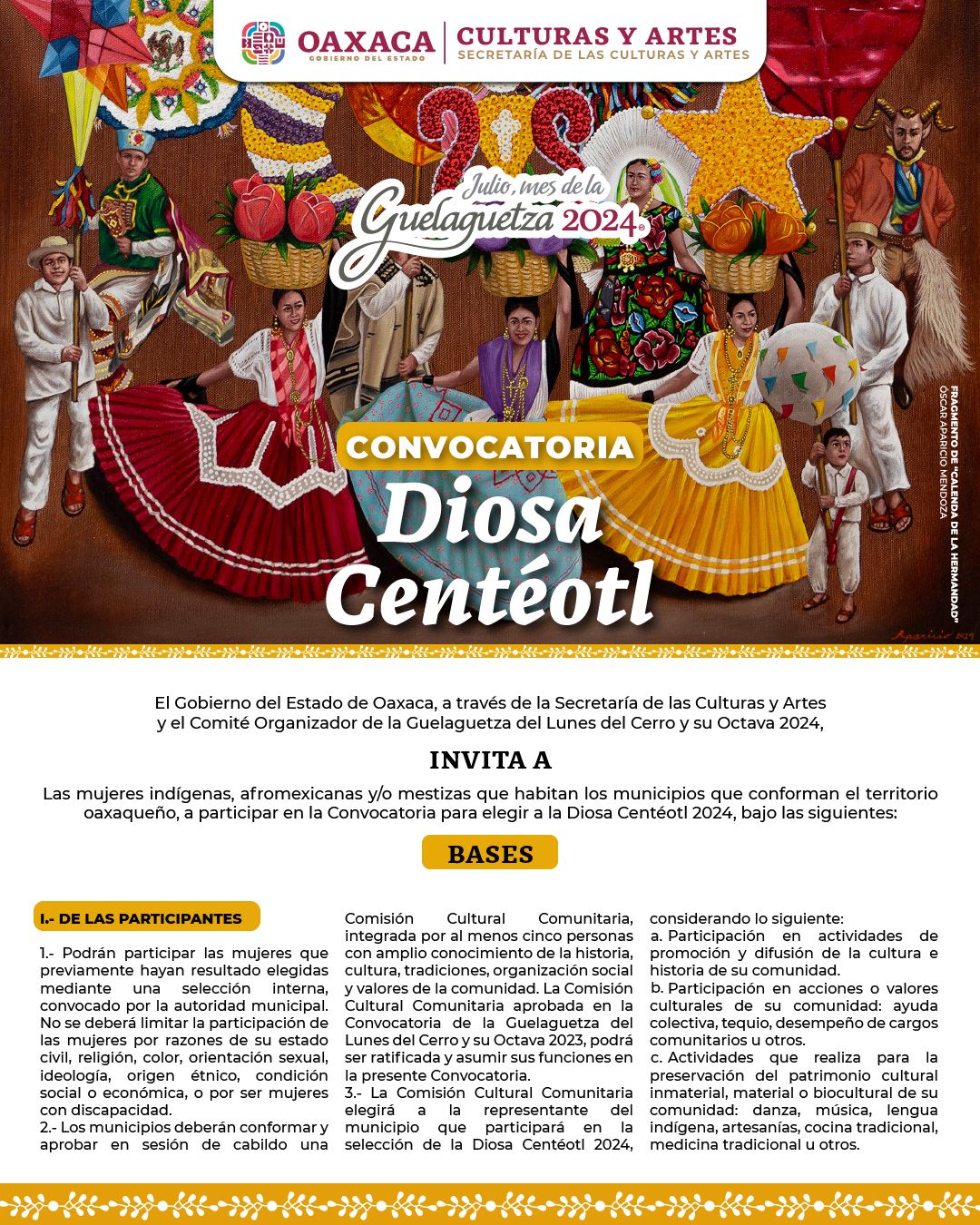 Oaxaca de Juárez, Oax. 28 de marzo de 2024.- El Gobierno del Estado de Oaxaca, a través de la Secretaría de las Culturas y Artes y el Comité Organizador de la Guelaguetza del Lunes del Cerro y su Octava 2024, convocan a las mujeres indígenas, afromexicanas y/o mestizas de la entidad, a participar en la Convocatoria para elegir a la Diosa Centéotl 2024.
