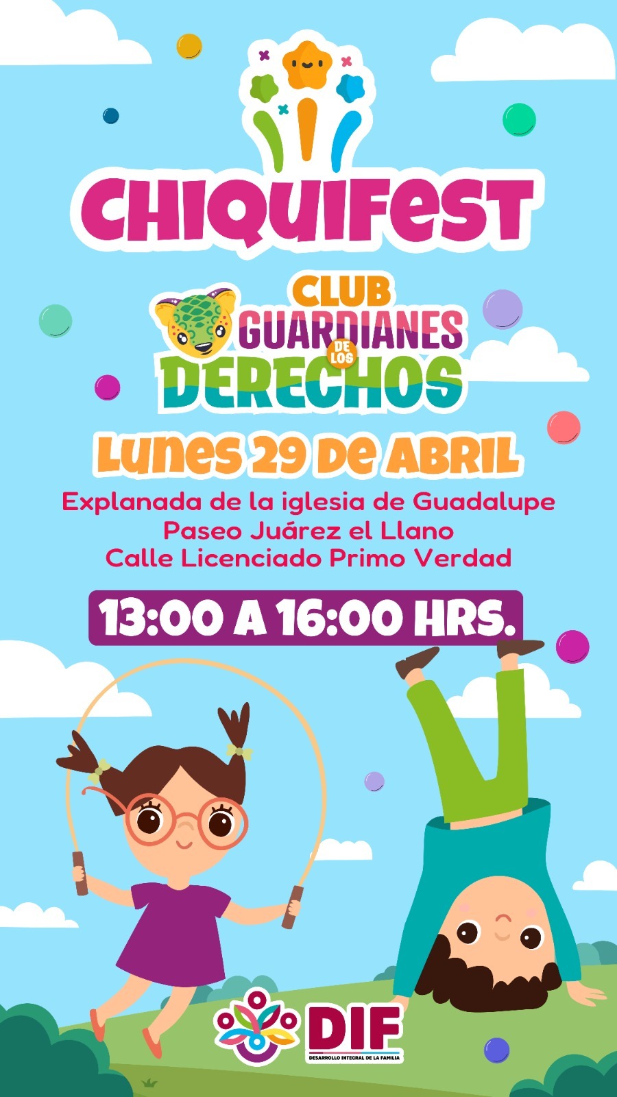 Oaxaca de Juárez, Oax., 26 de abril de 2024.- El Sistema para el Desarrollo Integral de la Familia (DIF) Oaxaca invita a las niñas y niños a participar este lunes 29 de abril en la actividad de promoción de sus derechos denominada Chiquifest en la explanada del templo de Guadalupe del Paseo Juárez El Llano, en la capital oaxaqueña.
