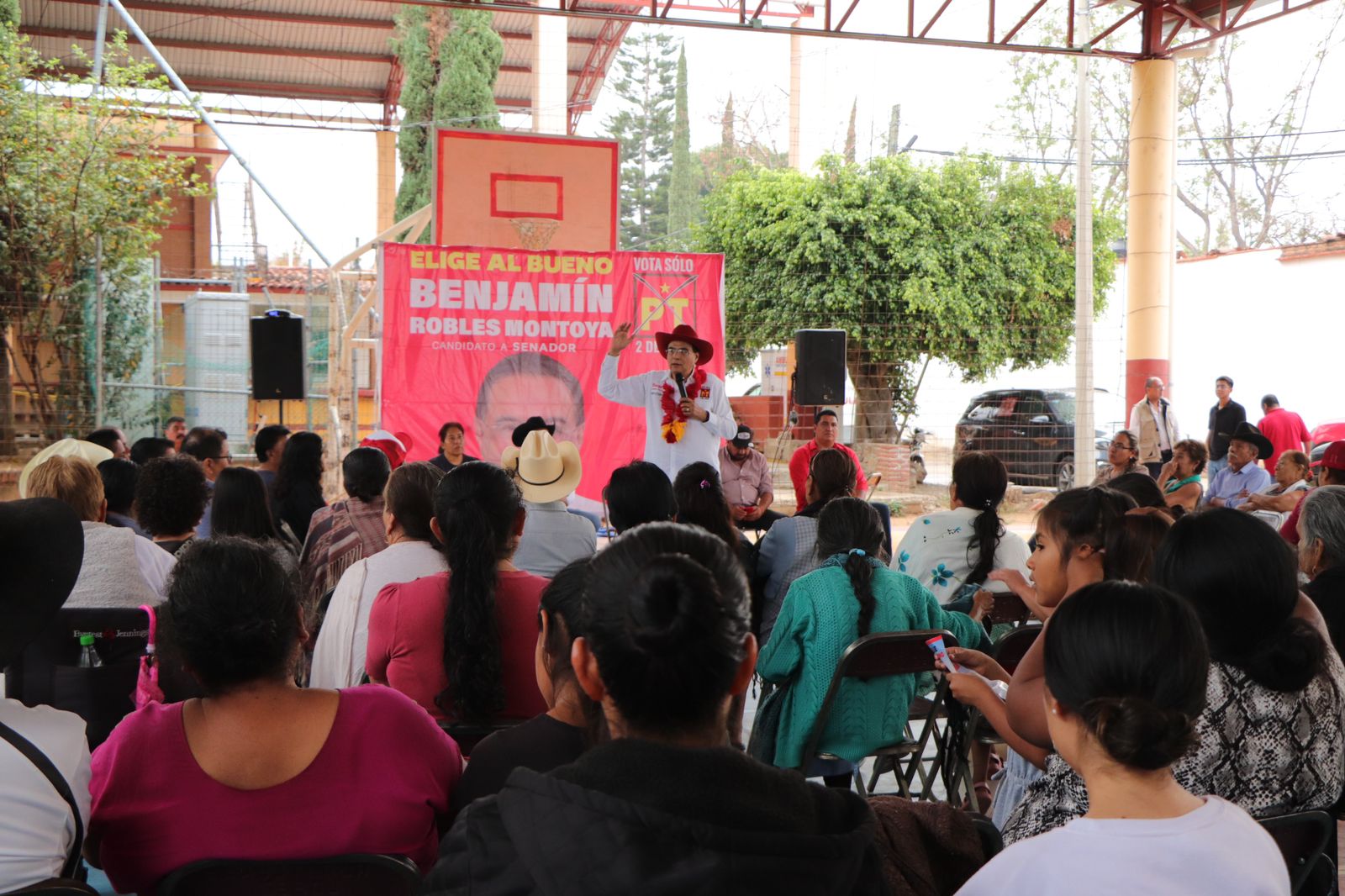 Y en la elección del Senado, elige a ‘El Bueno’, vota por Benjamín Robles, vota por el Partido del Trabajo, ¿me ayudan amigas y amigos?”, convocó el candidato petista a estos pueblos de la región de Valles Centrales de la entidad, verdaderos izquierdistas que han luchado con el presidente Andrés Manuel López Obrador.