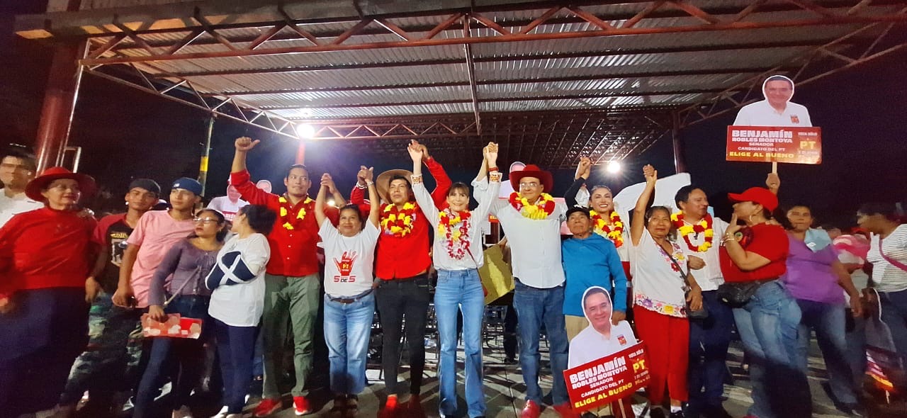 Yo, como ya lo dijeron aquí, fui invitado por Claudia Sheinbaum para ser candidato al Senado, yo gané la encuesta para definir al candidato de la coalición, pero el gobernador se puso a hacer berrinche, finalmente me dijo Claudia: tú vas a llegar al Senado, tienes mucha gente que te apoya, ayúdame, ve solo PT; pues les pedimos su apoyo, cuando les den sus cinco boletas, en las cinco les pedimos votar por el PT, el partido de la estrella amarilla”, manifestó Benjamín Robles “El Bueno”.
