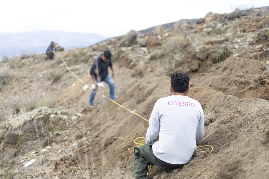 En esta comunidad que resultó afectada por un incendio forestal en los pasados meses de febrero y marzo, personal de la dependencia brinda acompañamiento y apoyo técnico para la apertura de zanjas bordo y cepas en la zona destinada a la reforestación.