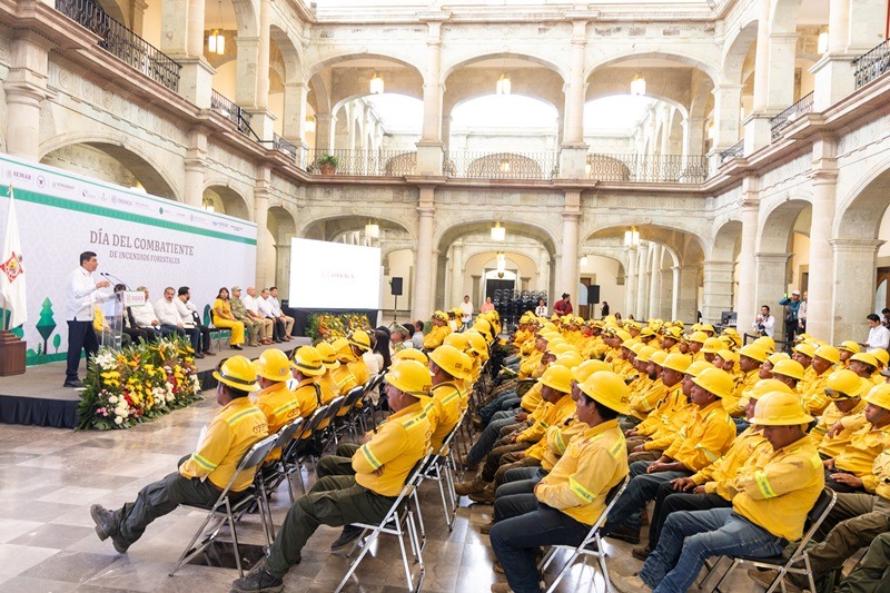 En Palacio de Gobierno, en el que asistieron representantes de las Fuerzas Armadas, autoridades municipales, funcionariado estatal, personal combatiente, comuneros y voluntarios, Jara Cruz destacó que como respaldo que brinda la Primavera Oaxaqueña a partir del mes de abril, se dotó de un seguro de vida para las y los combatientes de incendios pertenecientes a la Comisión Estatal Forestal (Coesfo)