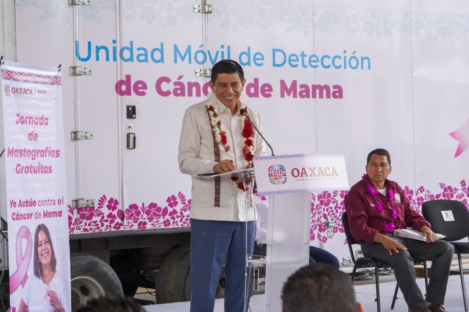 San Agustín Yatareni, Oax. 19 de julio de 2024. Toda vez que en México el cáncer de mama es la primera causa de muerte de las mujeres de 50 a 69 años de edad, el Gobernador Salomón Jara Cruz dio el banderazo de arranque de la “Jornada de Mastografía de los Servicios de Salud de Oaxaca”, que mediante seis Unidades Móviles recorrerán durante 6 meses los municipios del estado.