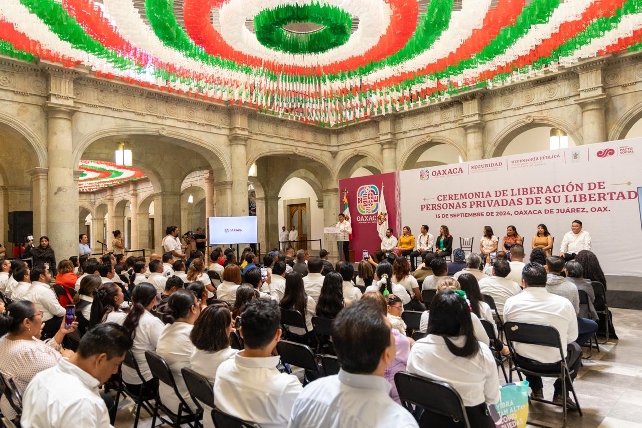 Oaxaca de Juárez, Oax. 15 de septiembre de 2024.- “La libertad es el bien más preciado para que las familias construyan su presente y futuro”, aseveró el Gobernador Salomón Jara Cruz al encabezar la entrega de mil 178 boletas de liberación a mujeres y hombres indígenas y de escasos recursos.