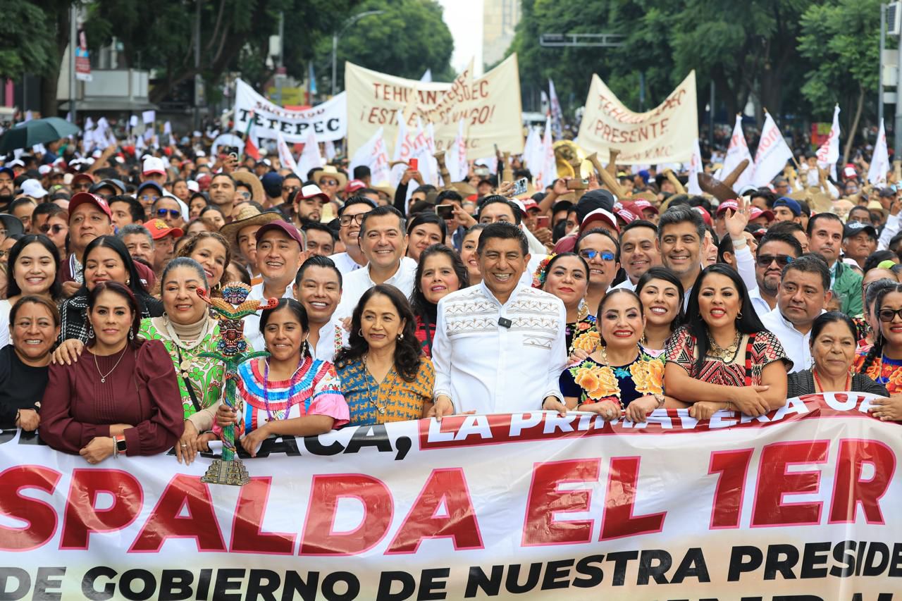 En la plancha del zócalo de la Ciudad de México, el Mandatario estatal encabezó a cientos de oaxaqueñas y oaxaqueños que expresaron su reconocimiento y respaldo a los resultados de la primera mujer Comandanta Suprema de las Fuerzas Armadas, y en los cuales Oaxaca ha sido privilegiado.